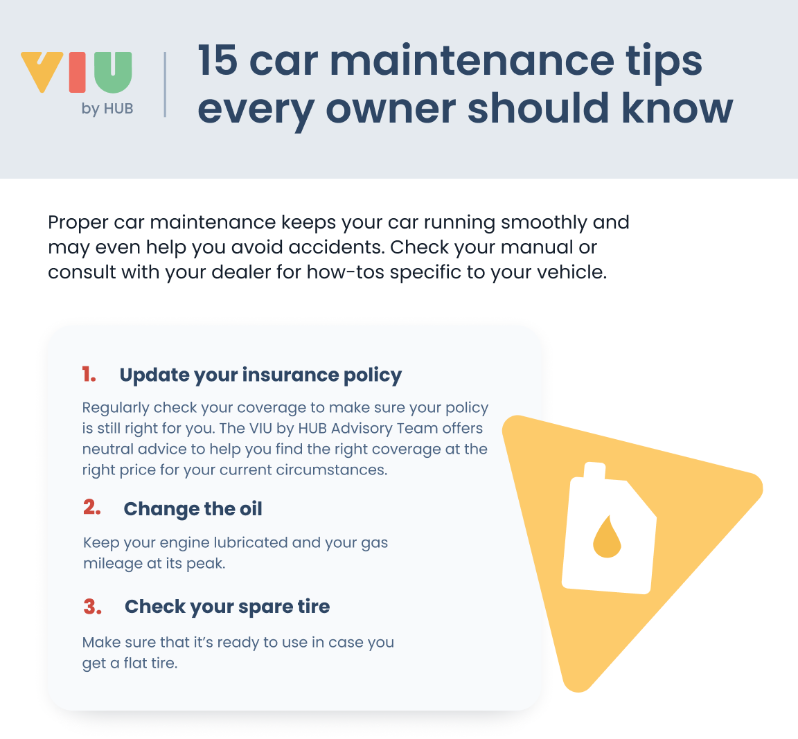 Your auto insurance policy likely won’t cover wear and tear, so it is important that you follow general car maintenance tips to keep it from causing you problems and out-of-pocket expenses. The VIU by HUB Advisory Team has put together this list of recommendations based on common problems that customers ask about when it comes to auto coverage. Staying up to date on these maintenance issues will keep your car on the road longer – and help you stay safe.